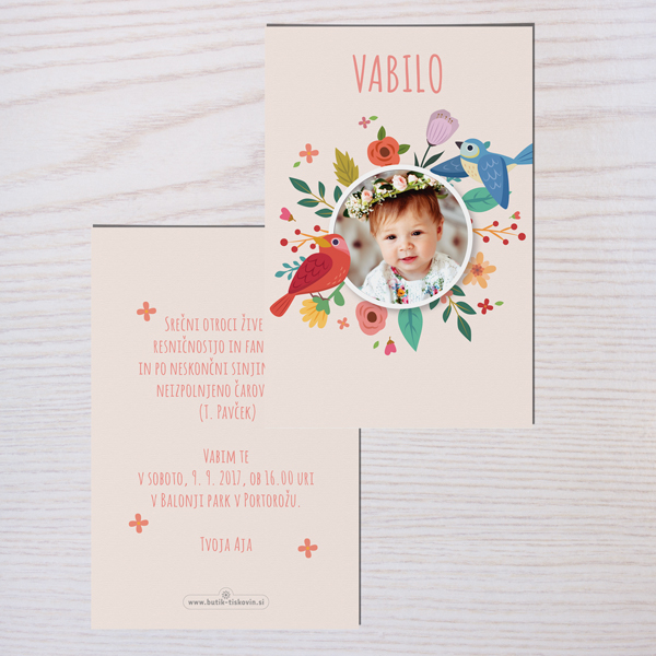 Vabilo za otroke dekliško s ptički.Poljubno lahko prilagodite tekst.Vabilo 10x15 cm ali 15x20 cm.