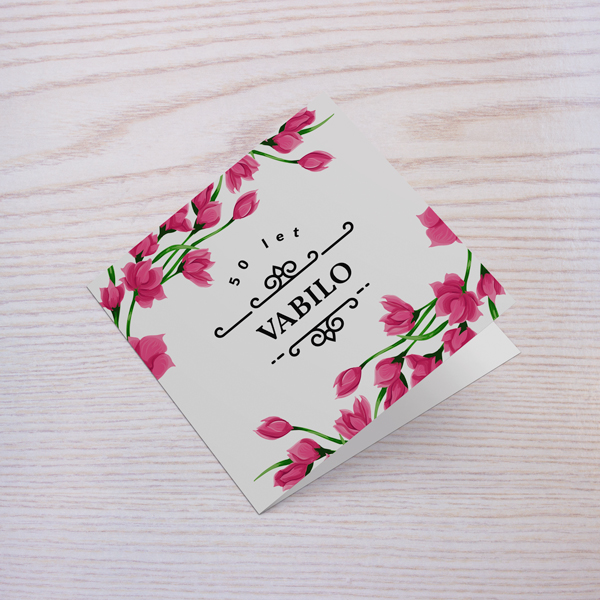 Vabilo z vzorcem cvetlice v temno roza barvi.Poljubno lahko prilagodite tekst na naslovnici in v notranjosti vabila.Vabilo 14x14cm - 1x zgibano
