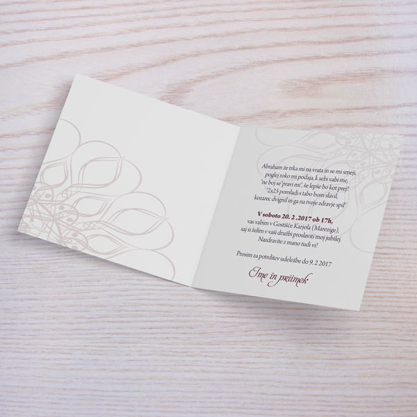 Vabilo belo z vijoličnimi vzorci.Poljubno lahko prilagodite tekst.Vabilo 14x14cm, 1x zgibano.
