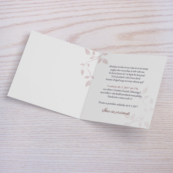 Vabilo z vzorcem metulja, cvetlic v rjavi, beli in roza barvi.Poljubno lahko prilagodite tekst.Vabilo 14x14cm, 1x zgibano.