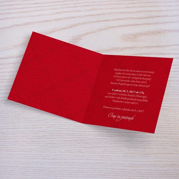 Vabilo rdeče z belim vzorcem.Poljubno lahko prilagodite tekst.Vabilo 14x14cm, 1x zgibano.